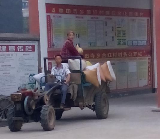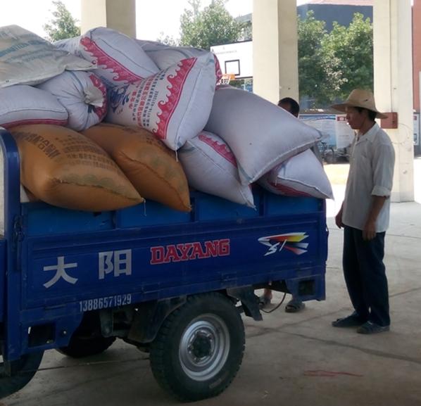 广大制种农户将晒好的种子用编织袋扎好开着自己的手护拖拉机、三轮摩托车前来金红村部过称售种。